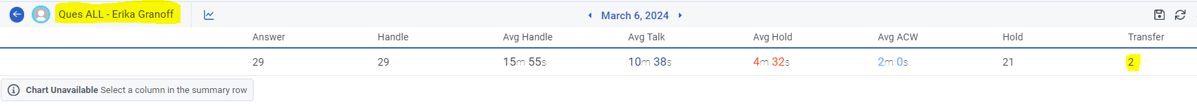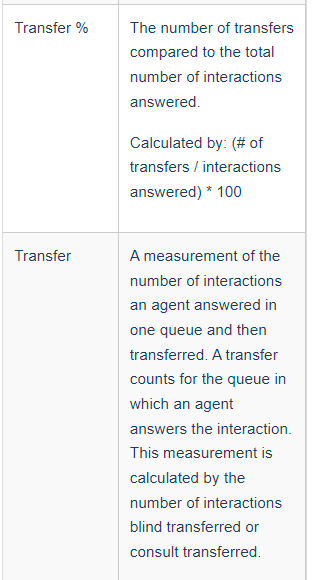 I am trying to find out how many calls are being transferred at the agent level.   When I run an agent performance report, I get a number of transferred calls and a percent of calls transferred.   When I go into the detail to Agent Performance, the count of Transfers is 2.