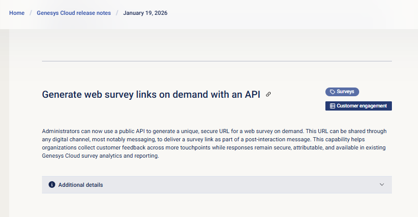 In the January 19 Genesys Cloud release notes, it was mentioned that a new feature is available to generate Direct Web Survey URLs using a public API.