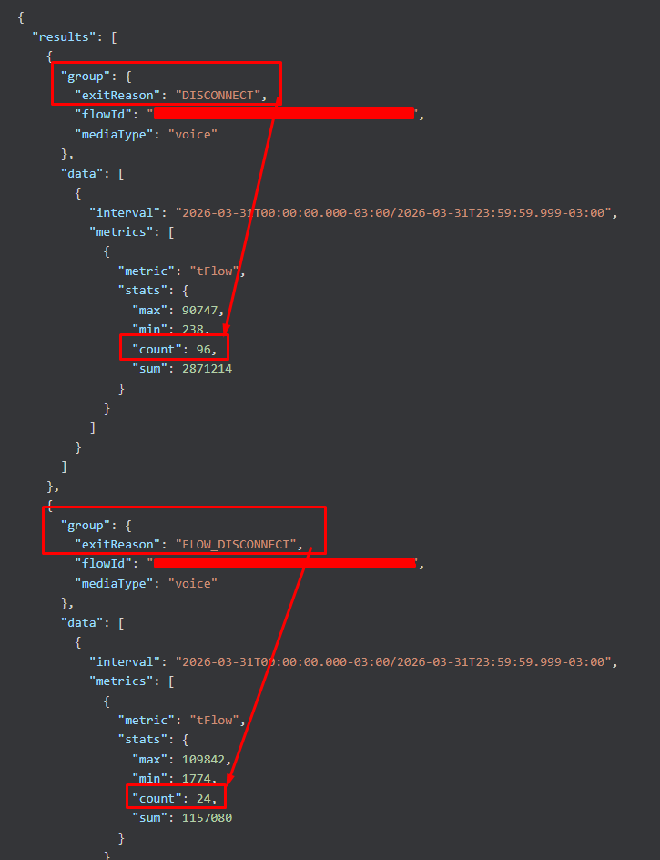 I'm also defining that I want my response to be grouped by the "exitReason" (This will show us if the disconnect reason was the customer disconnecting or the flow).