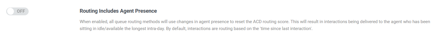 When enabled, all queue routing methods will use changes in agent presence to reset the ACD routing score. This will result in interactions being delivered to the agent who has been sitting in idle/available the longest intra-day. By default, interactions are routing based on the 'time since last interaction'.