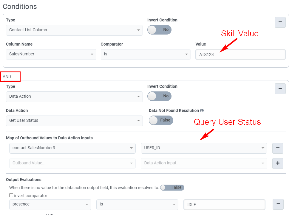 We already added a new column that includes agent ID to be used with the data action web service to return the user presence with an AND comparator that read another column to know the skill should be assigned to this contact. Yes, we can create a web service to return TRUE/FALSE but still, we will need to use multiple rules because you need to assign different skills on the pre-call action section based on data action response.