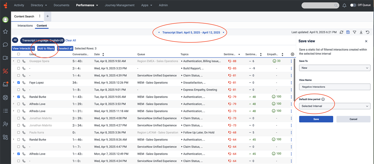 Administrators can now save a static list of interactions for a specific date range-directly from the Interaction List view or Content Search view. This means you can lock in a specific set of results based on a custom date range, and return to that same list any time without it changing.