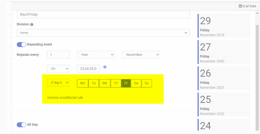 Here's a screen shot of old UI... with "remove conditional rule" and with "add conditional rule". You can also see the "iCal Rule" up in the top right and that's were you could add the iCal Rule which is similar to the RCF 5455.