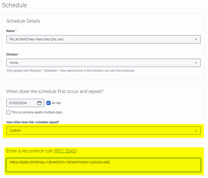 Also, if it was configured before with the nice UI and you want to read the schedule it now shows up as a custom occurrence in RFC 5545 format.