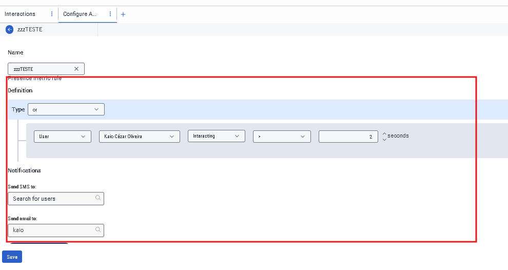 In the example below, when the agent Kaio (my user) is in the "Interacting" status, it will send an email or even an alert via Genesys.