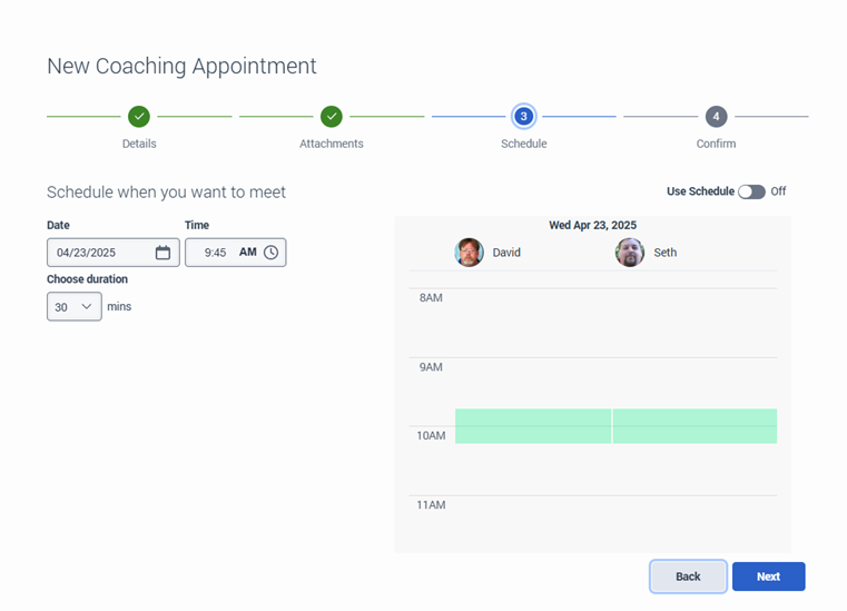 Even when the schedule is turned off, the system still logs the coaching appointment internally. This means Coaching is aware of that session, and will avoid creating conflicts with other Coaching appointments, whether they are scheduled or unscheduled. So within the Coaching tool itself, we are helping mitigate direct conflicts.