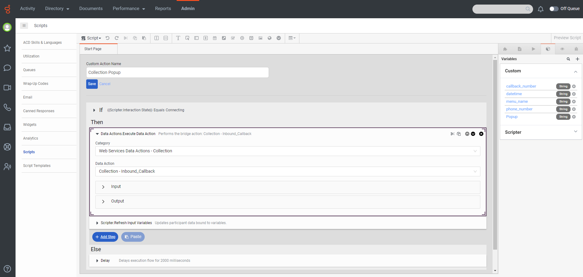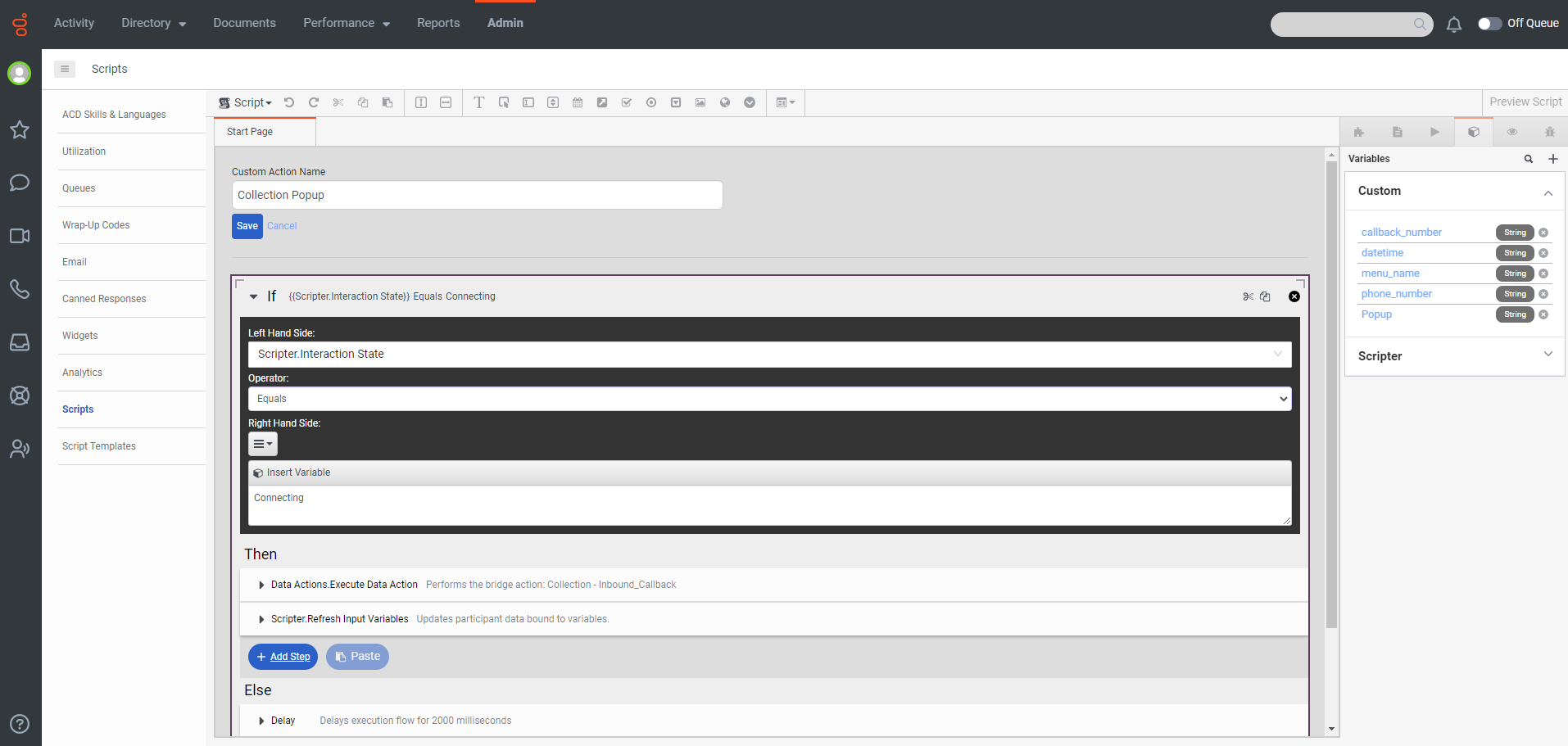 I would like to know if there is a way to make the action in the script run after the interaction state is connecting (after the agent presses callback to the customer)?