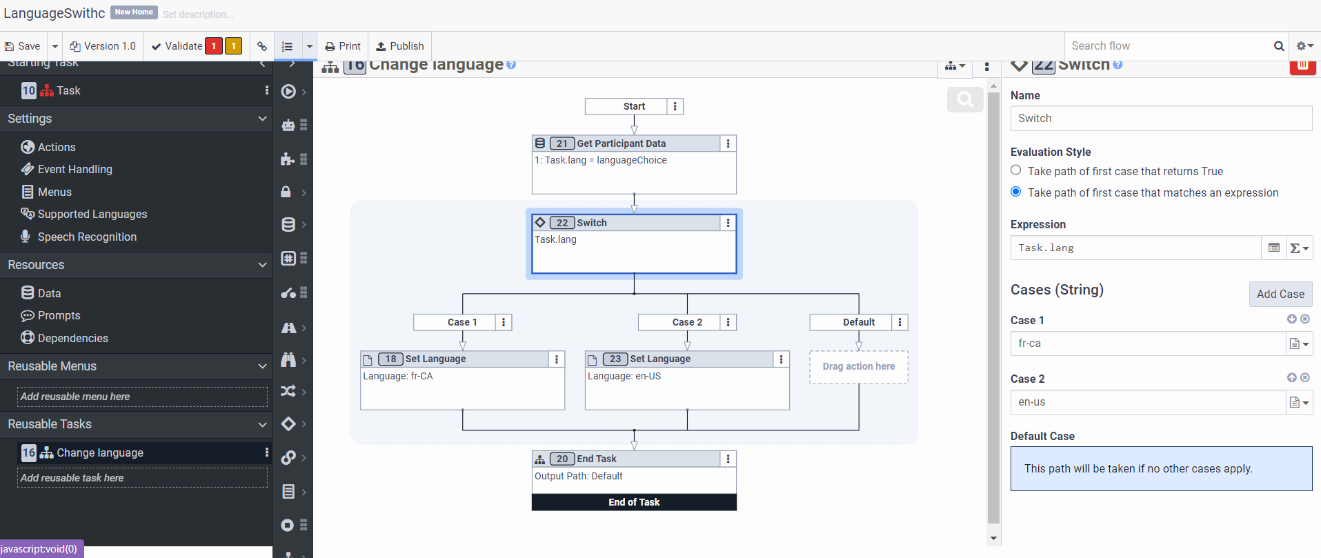 Note: If an interaction does not have a set language, then Architect uses the default language for the flow. For example, Architect transfers an interaction from one flow to another, and you set the language in Flow 1 but not in Flow 2. When Architect transfers the interaction from Flow 1 to Flow 2 and Flow 2 supports the language set in Flow 1, then Flow 2 defaults to that language.