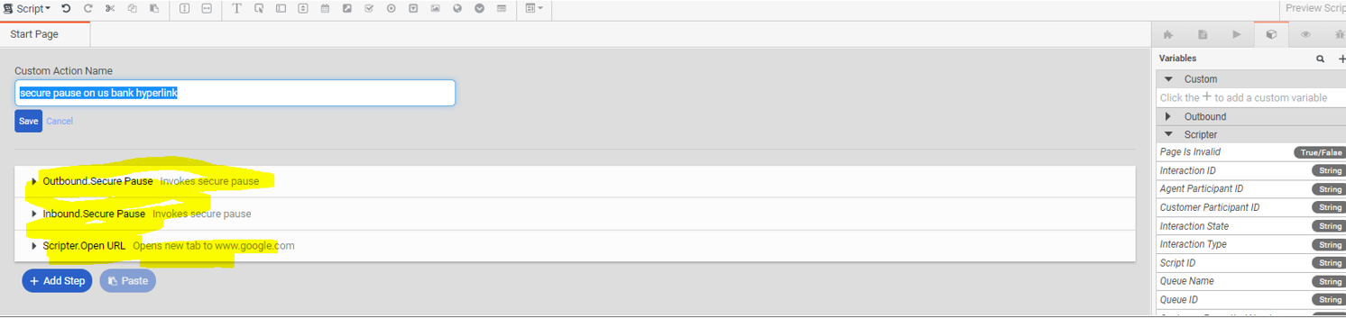 I have a use-case where while an inbound call , agent screen pop will come with a Bank's link . Should agent click on this link all screen and call recording should stop . so i created a custom action inside my script which would initiate a secure pause whenever this bank's link will be clicked .