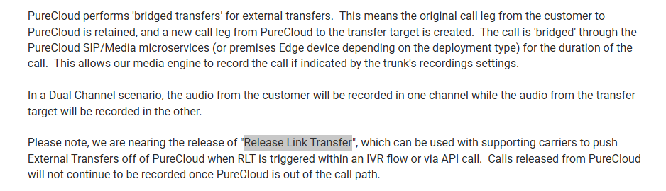We tried removing trunk A record through Transfer but in doing so, the 2nd segment of the call, the Microsoft Bot did not record either. I need to record the inbound call, call to the Bot, call to agent/group/flow, etc... but if an external transfer is dialed (without any Genesys Cloud Party) it should not be recorded.
