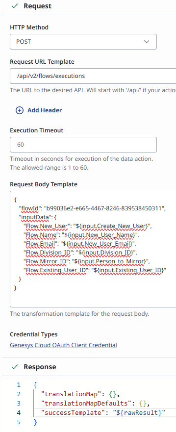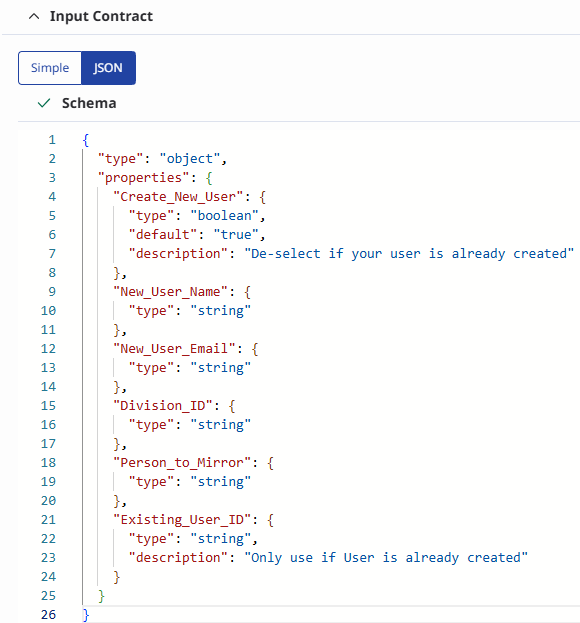 Hello, I am creating a data action that will pass along data to a workflow but there are a few fields that might be empty and its not running with them empty. My goal is that if one of the fields is empty, it will put in a default value so that it will still run. The three fields that might be left empty are "New_User_Name", "New_User_Email", or "Existing_User_ID". I know I can set default values as shown with the "Create_New_User" input but I was hoping that you wouldn't be able to see the value from the testing page.