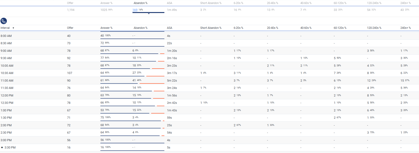 This will open the Abandon Intervals Metrics view, where you'll see the breakdown across the configured time intervals, including short abandons.