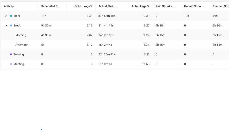 Could this also be created in a fashion similar to the inverse of the Historical Adherence tool? In HA, we can see the Agent, and expand on their Scheduled versus Actual activities. But perhaps in the Shrinkage view, we could see the Activities and expand to see which agent is contributing most to shrinkage in that activity(ies)?