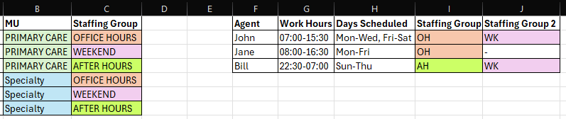 Does anyone have any thoughts about assigning agents to multiple Staffing Groups or other work arounds? An example below, I want to assign agent John to our "Office Hours" and "Weekend" staffing groups. Reason being is we would like to limit time off allocations based on Mon-Fri in our OH staffing groups and Sat-Sun in the WK staffing group.