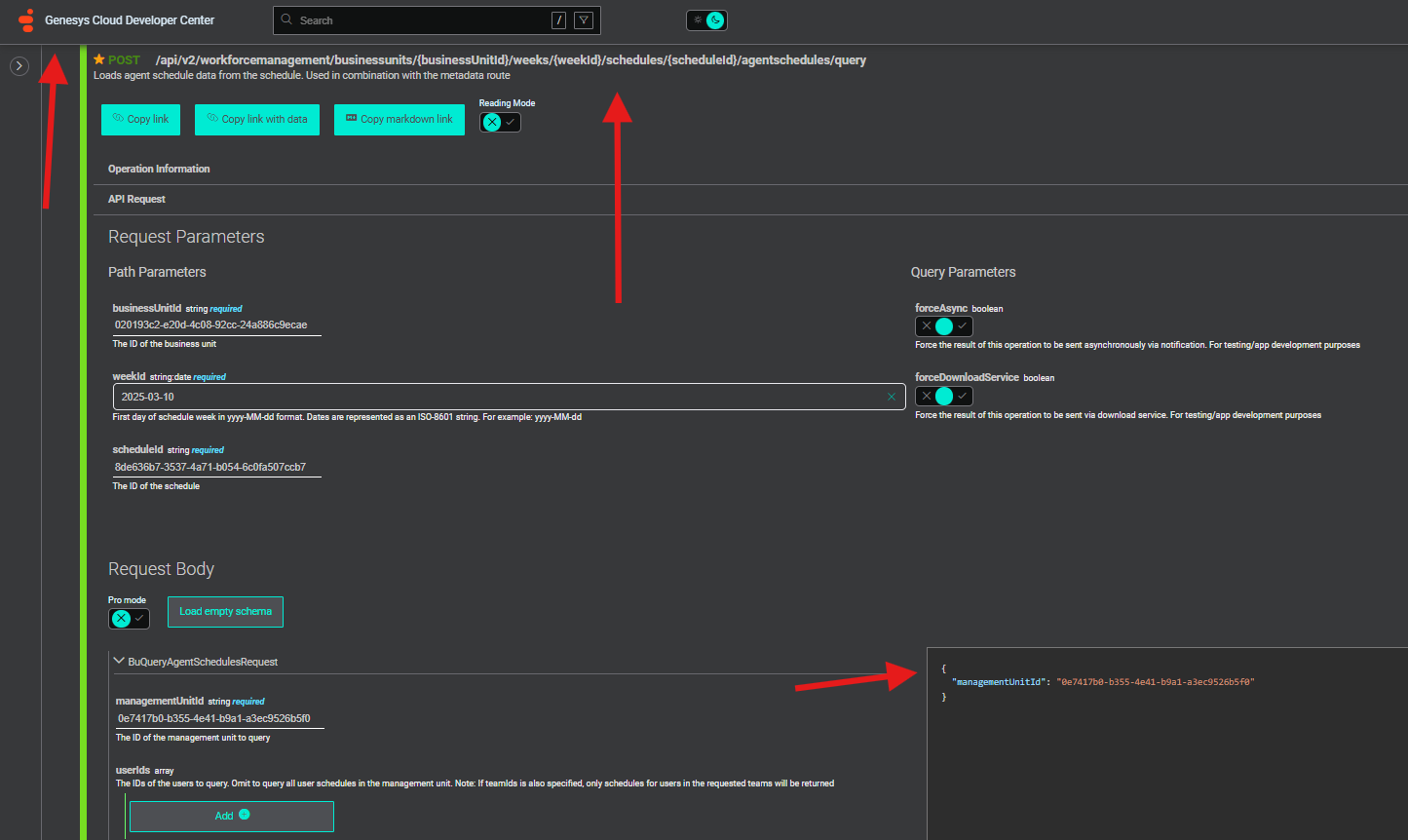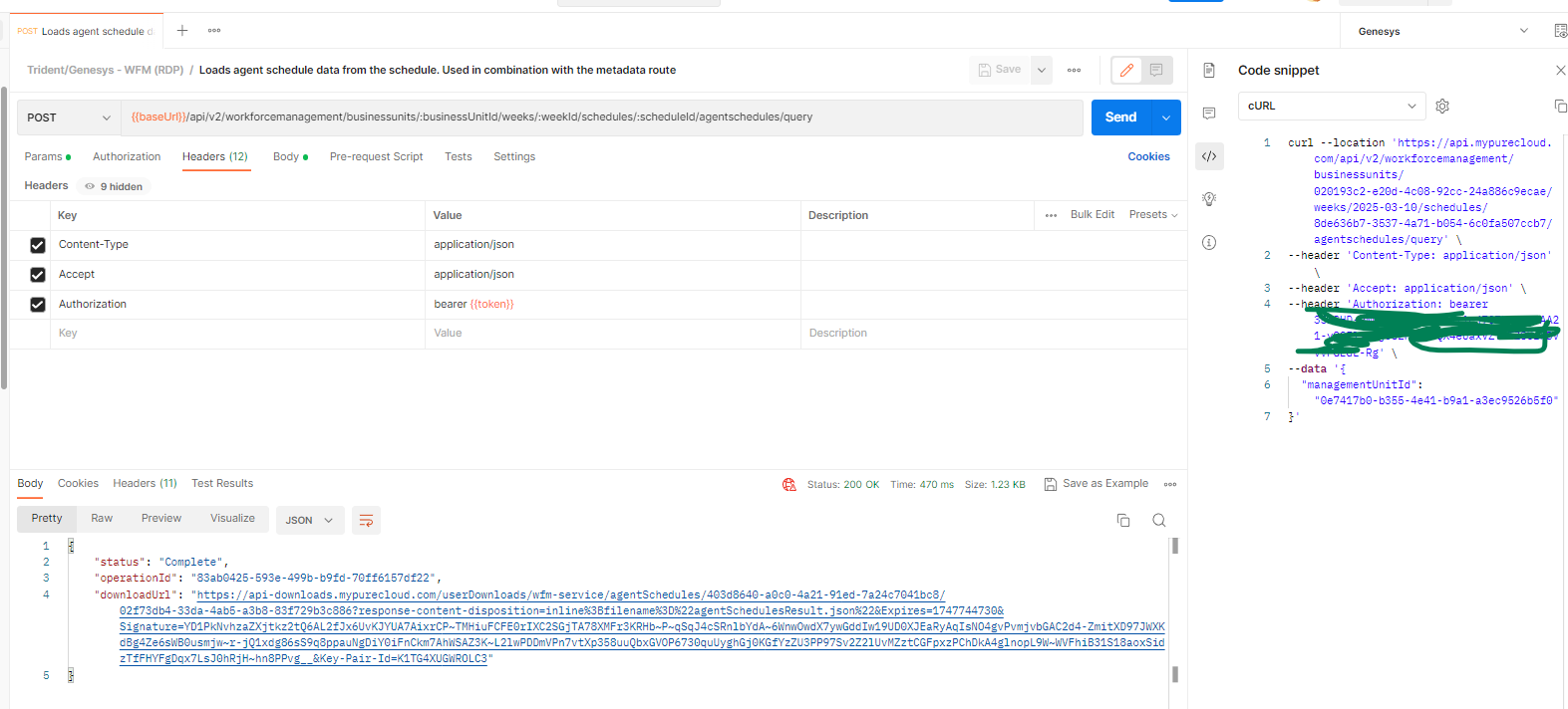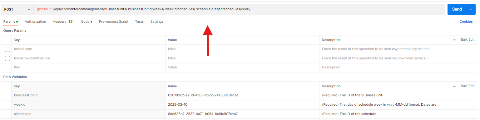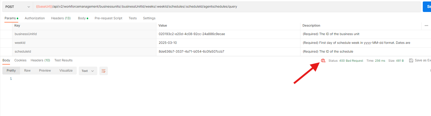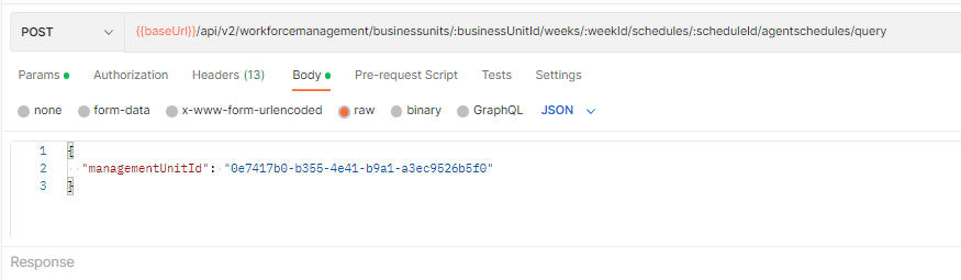 We are using POST - /api/v2/workforcemanagement/businessunits/:businessUnitId/weeks/:weekId/schedules/:scheduleId/agentschedules/query and providing valid path variables key businessUnitId, weekId (yyyy-MM-dd) and scheduleId. In postman under Body RAW we put valid managementUnitId but still I am getting Status 400 while calling the API.