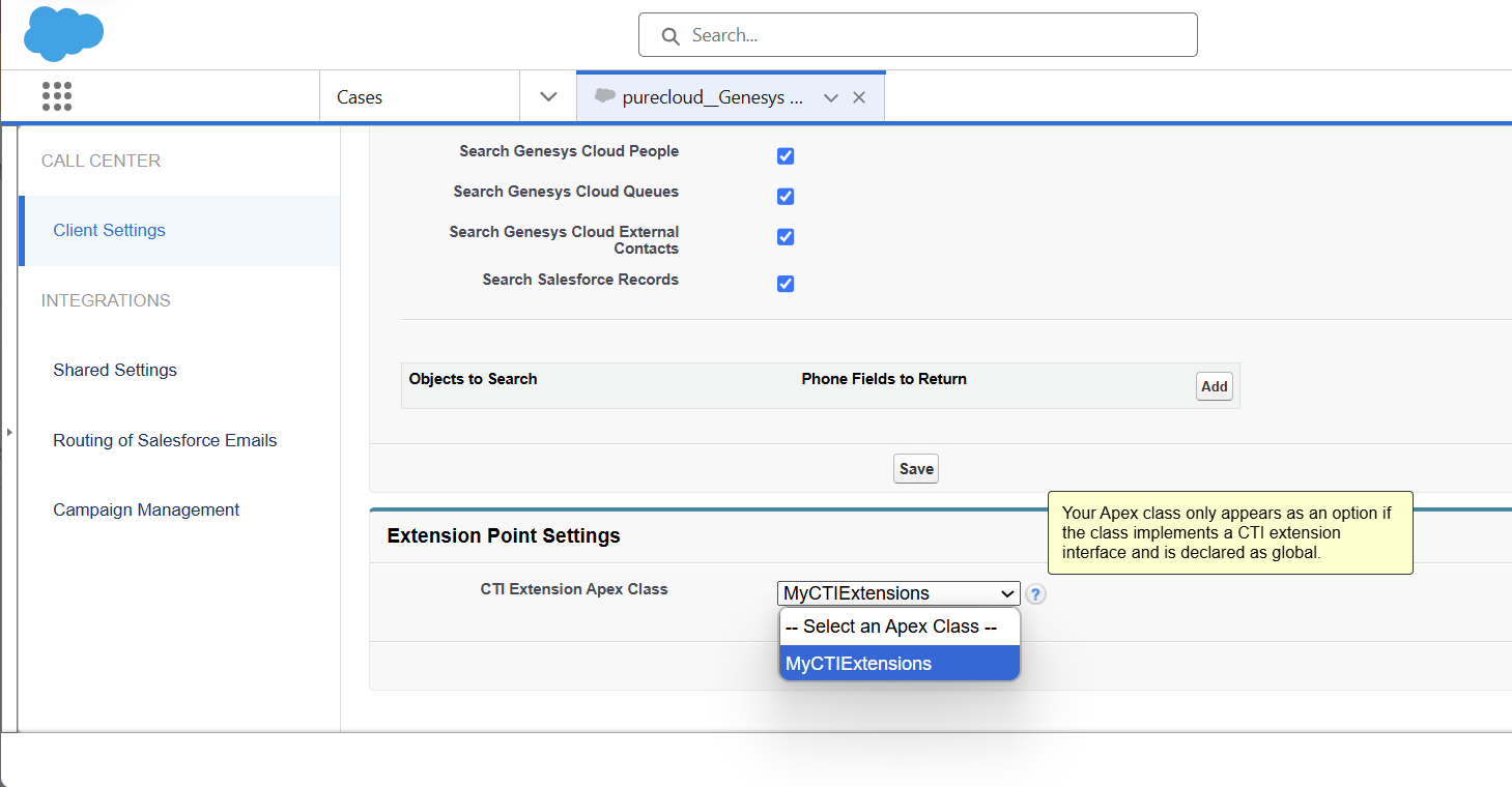 The only bit I found a little confusing in the documentation is that you have to create this apex class, and then select it in the 'Extension Point Settings' in the call centre settings within Salesforce. I get to this page in Salesforce by going Setup -> Installed Packages -> Click 'Configure' next to 'Genesys Cloud for Salesforce' -> select the relevant 'Call Centre' and then at the bottom of the page will be this 'CTI Extension Apex Class' option as shown in the screenshot.