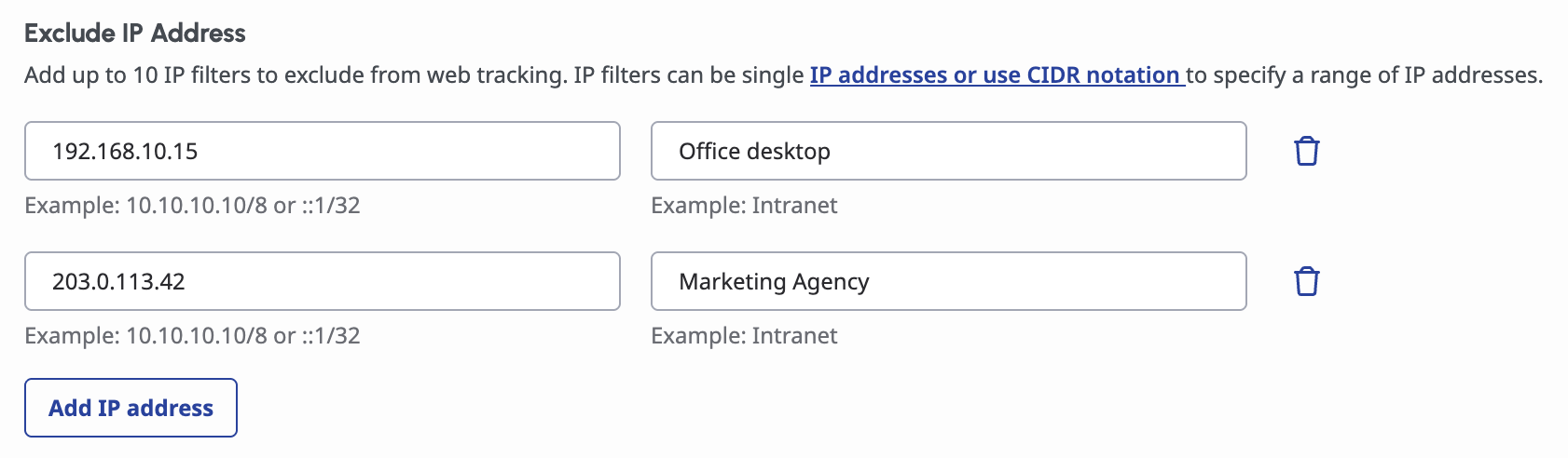Administrators can exclude individual IP addresses or IP groups to prevent the collection of internal or non-customer data. Their data will no longer be collected to prevent tracking unwanted employee navigation and mixing internal traffic with actual customer traffic.