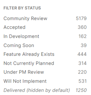 What all this means is that your voice matters. Ideas submitted to the site are really looked at and considered by the PM's. Many ideas are also roadmap items that developers submit so users can comment on the idea for further improvements. Some may doubt the effectiveness of system, but take a look at these numbers.<o:p></o:p>