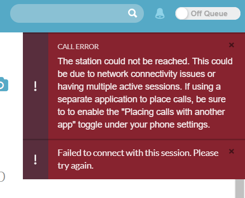 • 1.  The station could not be reached. This could be due to network connectivity issues or having multiple active sessions. If using a separate application to place calls, be sure to to enable the "Placing calls with another app" toggle under your phone settings.