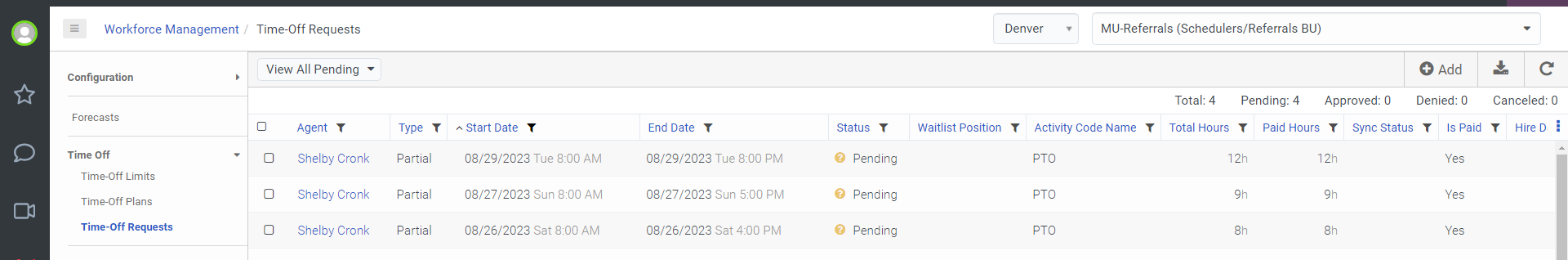 Have everything set up to appropriately count against the time off limit and then be wait listed after, but time off requests are not showing as Pending-Waitlisted, only as "pending." Have done this multiple times in other orgs for other clients with success; same set up in a new US West org is presenting issues.
