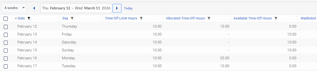 You can see that on Feb 16 there are 20 hours approved, though only 10 were available. We also used to see a negative remaining balance when this happened, which we are not seeing today.