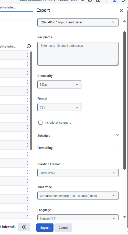 Hi, all. I have been searching for a solution in terms of understanding the csv format when exporting Topic trend details and other speech analytics related data, but I was not successful. When I do an export to .csv The interval start date is totally wrong and not all the data in the file is , delimited. It means that when I convert it to excel format, it replaces some of the data in the document which renders an unusable report.