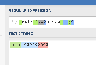 I have not tried this out, but you might add (tel:)?\+? in front of your RegEx, because Architect should be converting the number to E.164 format before dialing.