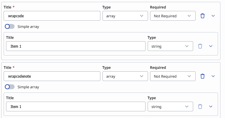 You'll need to change the Input Contract to have wrapcode and wrapcodenote set as arrays each with one item listed in the array.