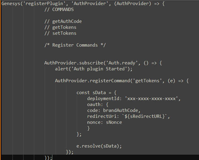 In the example I linked, `AuthProvider.registerCommand` is called outside of the `Auth.subscribe` function call, whereas in your example it is called inside the `Auth.subscribe` function. I think you need to register the 'getTokens' command outside of the 'subscribe' block, then call `AuthProvider.command('getTokens')` in the `Auth.subscribe` callback.