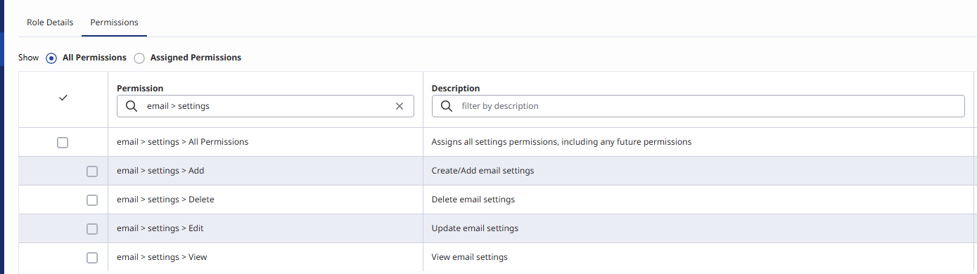 I've successfully installed a Microsoft Graph API Integration in my Org. When I add my Domain as a Graph API Domain using this integration, the domain was created successfully, but I got an error message that stated - "Unable to display the domain due to missing permission email:settings:view". I am a Super Admin with custom Super Admin Roles that has visibility to literally everything in the Org. When I try to locate the permission email:settings:view, I can't find it in the Permissions list available for assignment in any Role. When I try to find the permission by trying the search terms "Email > " within a Role, I can't find one. Without this, I am unable to edit the domain settings or add routes under it.