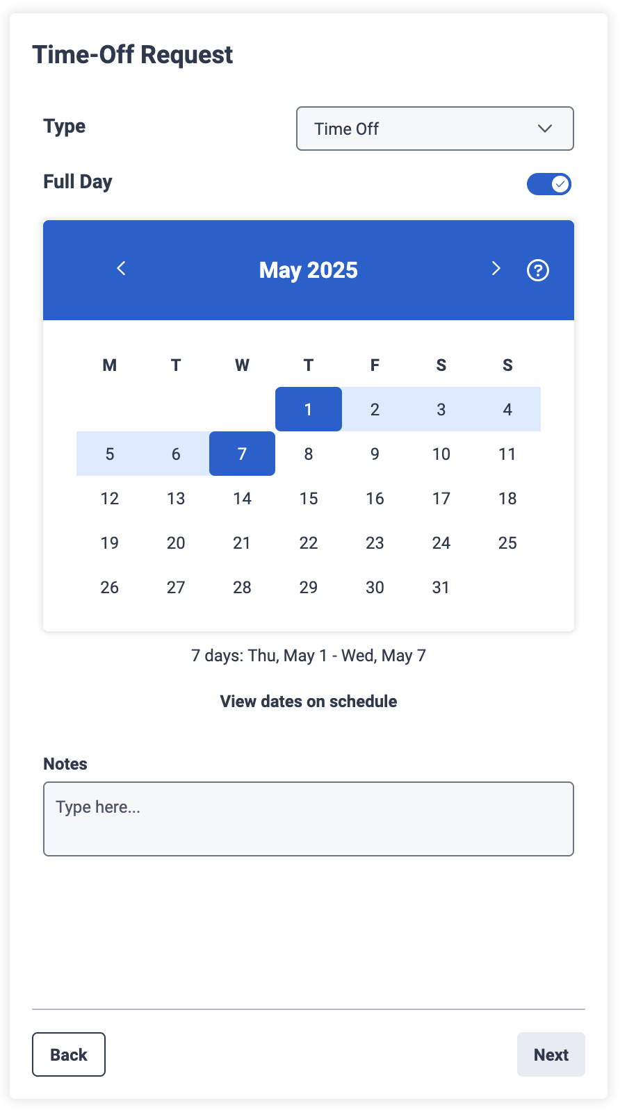 - The "Full Day" versus "Partial Day" selection is a recurring point of confusion for some agents, even after training. It often results in incorrect requests, and due to the lack of WFM options to change this Full or Partial Day status, the request must be resubmitted either by the agent or WFM. We think there might be room for exploring UI designs here that make the distinction even clearer, perhaps moving towards something like a dedicated "Partial Day" option or a toggle that explicitly changes the mode instead of the current slider.