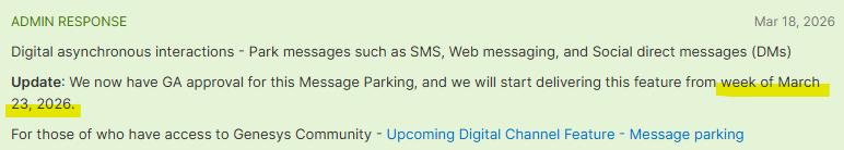 Is there a date planned for this feature release, and is this feature that we could enable in our non-prod region first before exposing to the production users? We want to understand how this could impact the workflow for the various digital channels, (SMS, email and web messaging). Good progress on this feature, thank you.