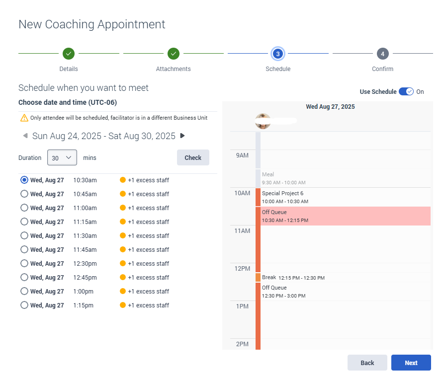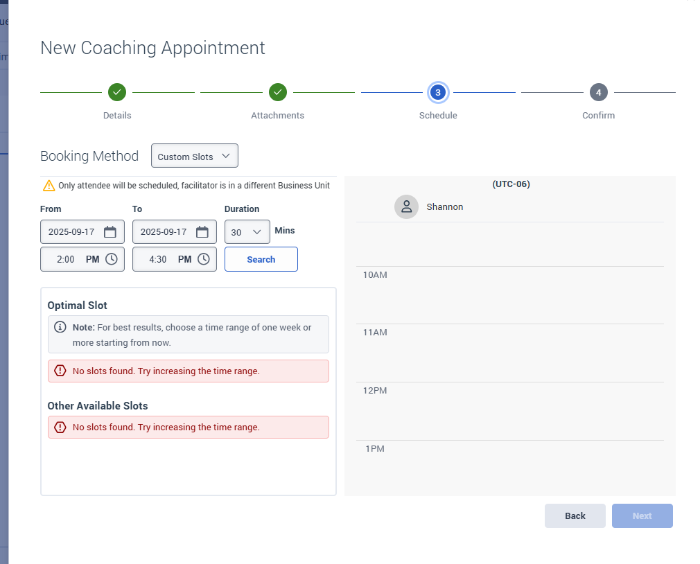 This is the default method when booking Coaching or Learning appointments manually. It uses WFM service goals to search across a six-week window and identify the single most optimal time slot. We also include a second slot for "tomorrow" since next-day bookings are a common pattern.