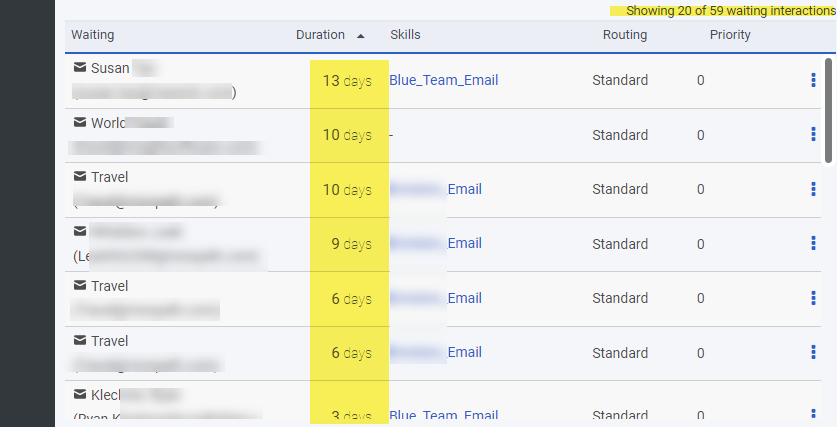 Overnight, we now see emails that are sitting in queue will show a a total amount of time since the first inbound interaction came into the queue. During most email interactions, there is a back and forth and each reply from a customer that comes back into the queue will be stamped with a new Duration time. Now all interactions are showing a total cumulative duration of days, not hours or minutes.