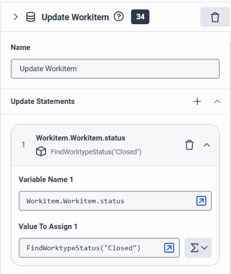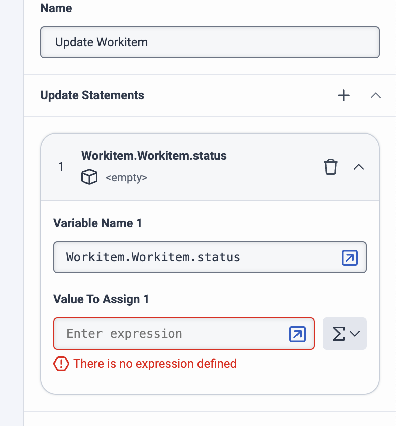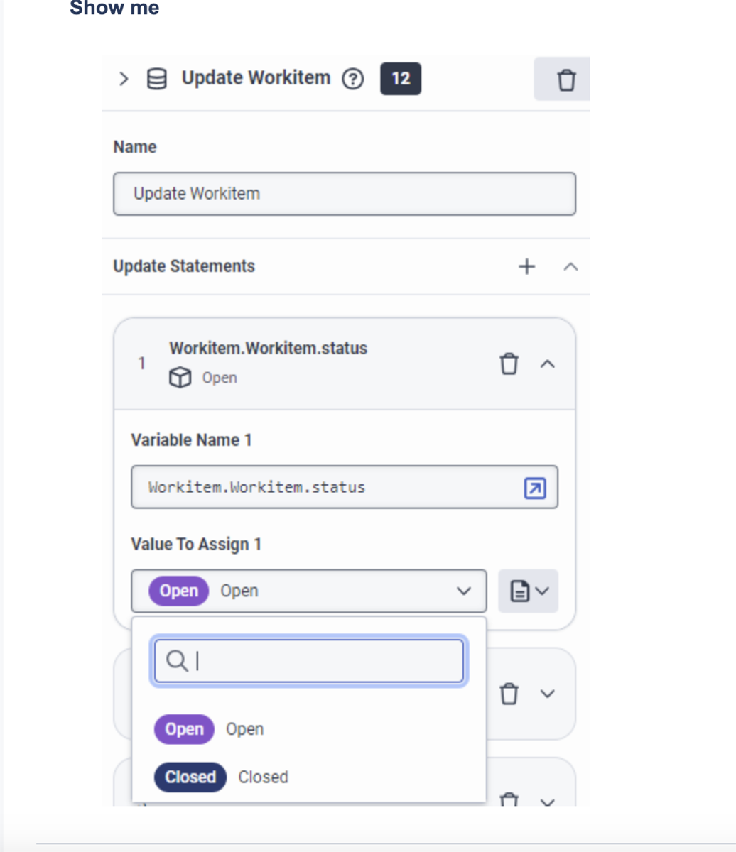 I have update data block, selected Workitem.workitem.status, however it does not give the literal options to set. only expression, so not able to set to my new status.