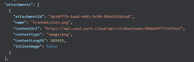 The contentUri gives a URL that the attachment can be retrieved from, using the Downloads endpoint /api/v2/downloads/{downloadId}.