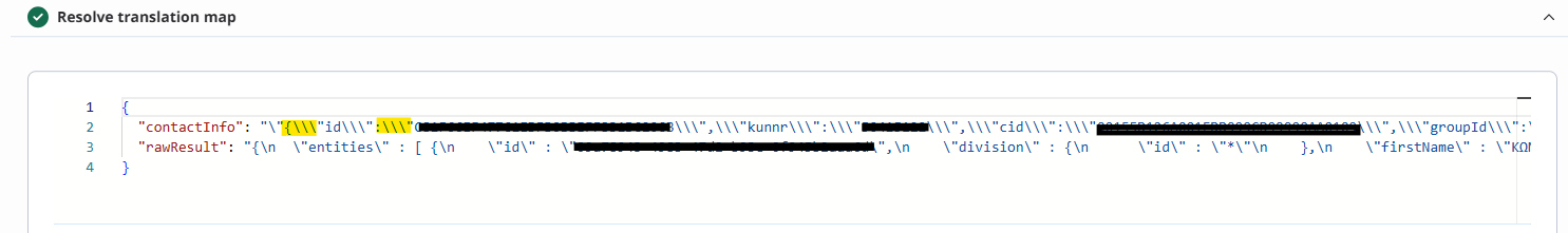 I face a problem using $esc.jsonDecode(). I am trying to get a field that is filled with JSON in string form and transform it to JSON object, in order to get some specific fields from it. To be more specific, I save the JSON in string form in the field $.entities[X].customFields.example_field and I retrieve it in translation map to a variable. Then, in successTemplate I try to transform it to JSON to save it to a variable that is declared as object in Contracts. Example response configuration: