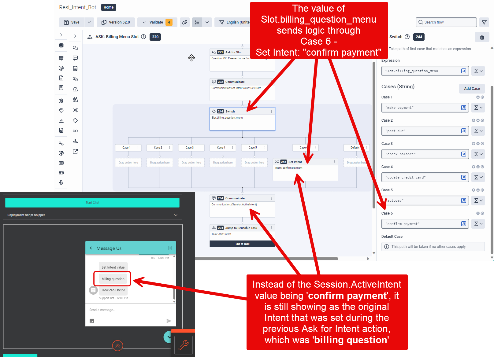 This is a simple example of a user responding to an Ask for Slot action, and my flow logic attempting to use that value to Set Intent action in an upcoming Ask for Intent action:
