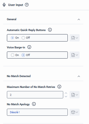 The slot is configured to accept any value, so whatever the user says or types is returned in the same output field.