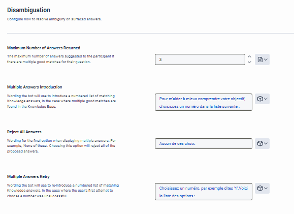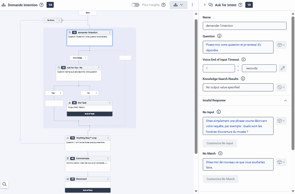 I used the default configurations. The org I tested is Genesys Cloud CX 3. I used an Ask for Intent action and, inside it, I selected the Knowledge path. To reach the disambiguation step, I said a generic phrase so the NLU wouldn't return a 100% match, and then it followed the standard settings.