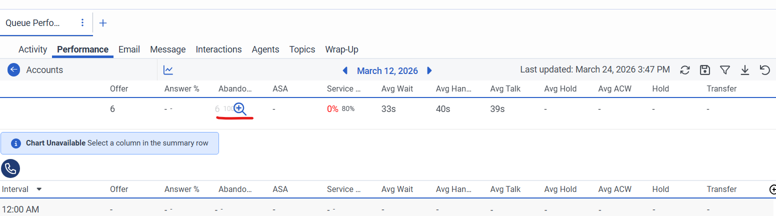 If you access a specific queue using the queue performance workspace and hover the mouse over abandoned and see a + icon.