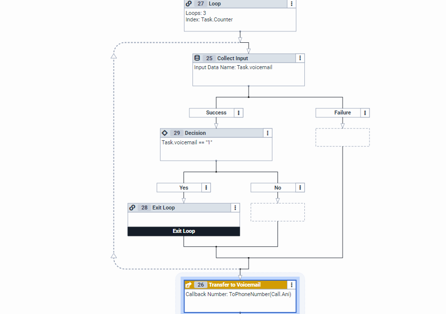 The above solution worked for voicemail, but I want to request one more thing. When the system prompts about voicemail, if user selects nothing, it should continue to play prompt. And again, it should ask for voicemail. Even though while listening to prompt(audio) if user selects the DTMF of voicemail which was in prompt, it should redirect to voicemail. Loop case is failing here, it's not repeating the prompt and the call not getting disconnected though we are disconnecting in the flow. Kindly suggest.