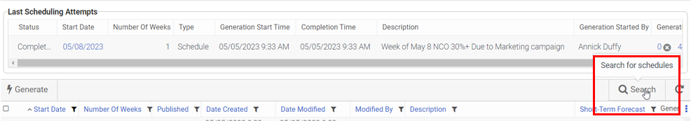 The schedules list displays a maximum of 26 weeks prior and 26 weeks forward from the earlier of the current week or the last week in which a schedule exists. Use the search feature to find schedules, including those outside the +/- 26-week window. If you create many schedules per week, you may have to search for schedules between the 6–26 week range both in the future and the past.