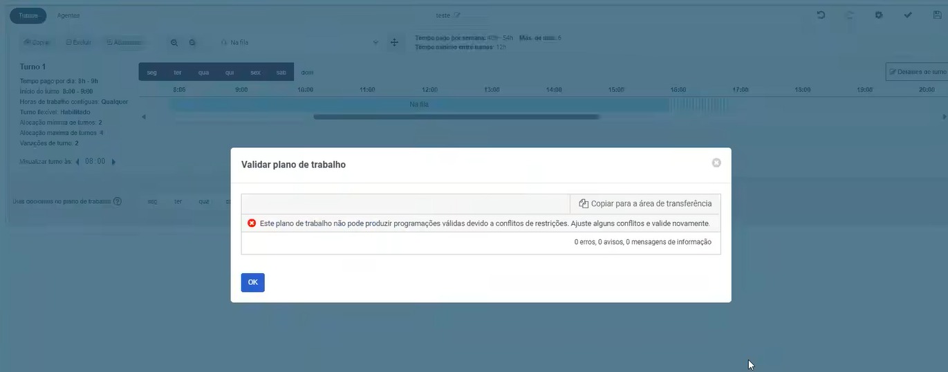 When I check the "Day Off Rules" option-both for Next Day and Previous Day-and define the shift with a planning period, WFM doesn't validate and returns a conflict error in the work plan (as shown in the second screenshot).
