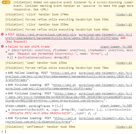 Thanks for the clarification. The settings are not being violated. Below are the Console Log and Network Log. Thanks for the help!