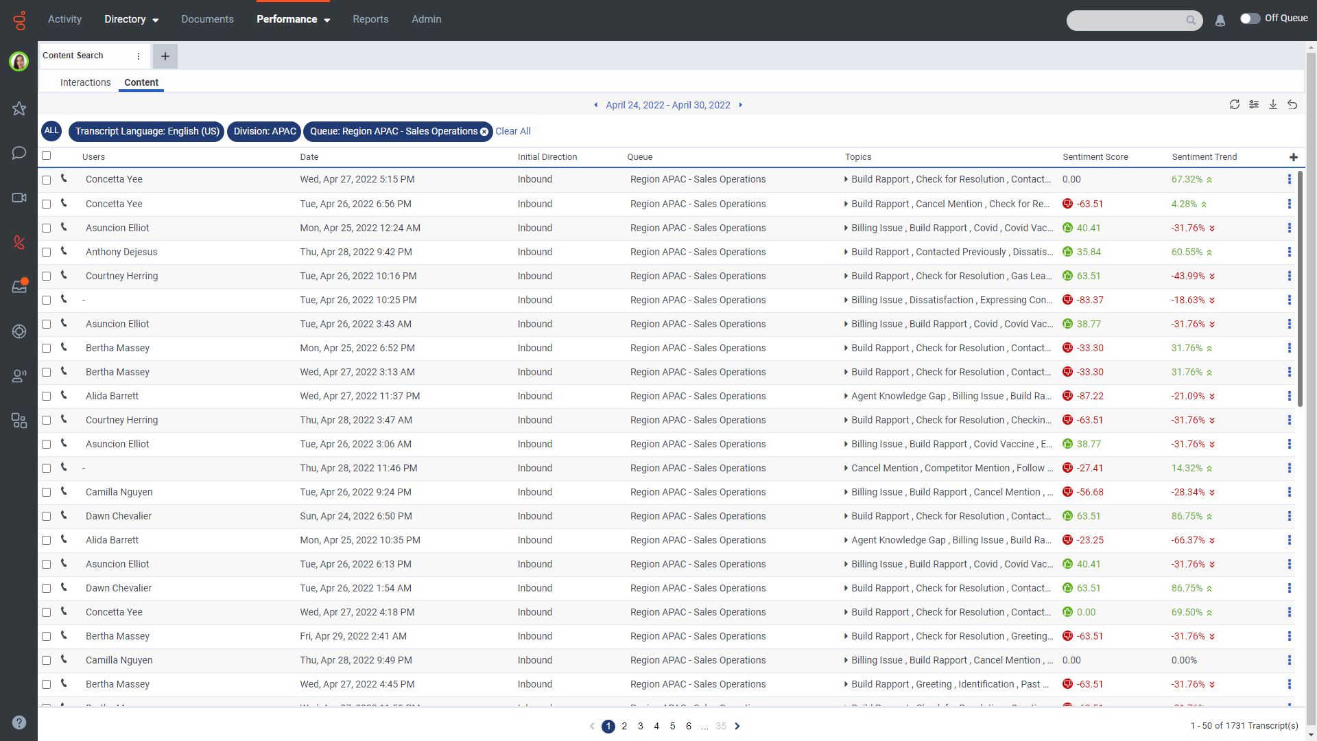 Contact center managers and supervisors can now filter interaction transcripts by topics detected within interactions in the Content Search view. This feature enables managers to pinpoint interactions in which customers expressed a specific contact reason or customers or agents exhibited specific behaviors. A Topics column is also now included in the Content Search view.