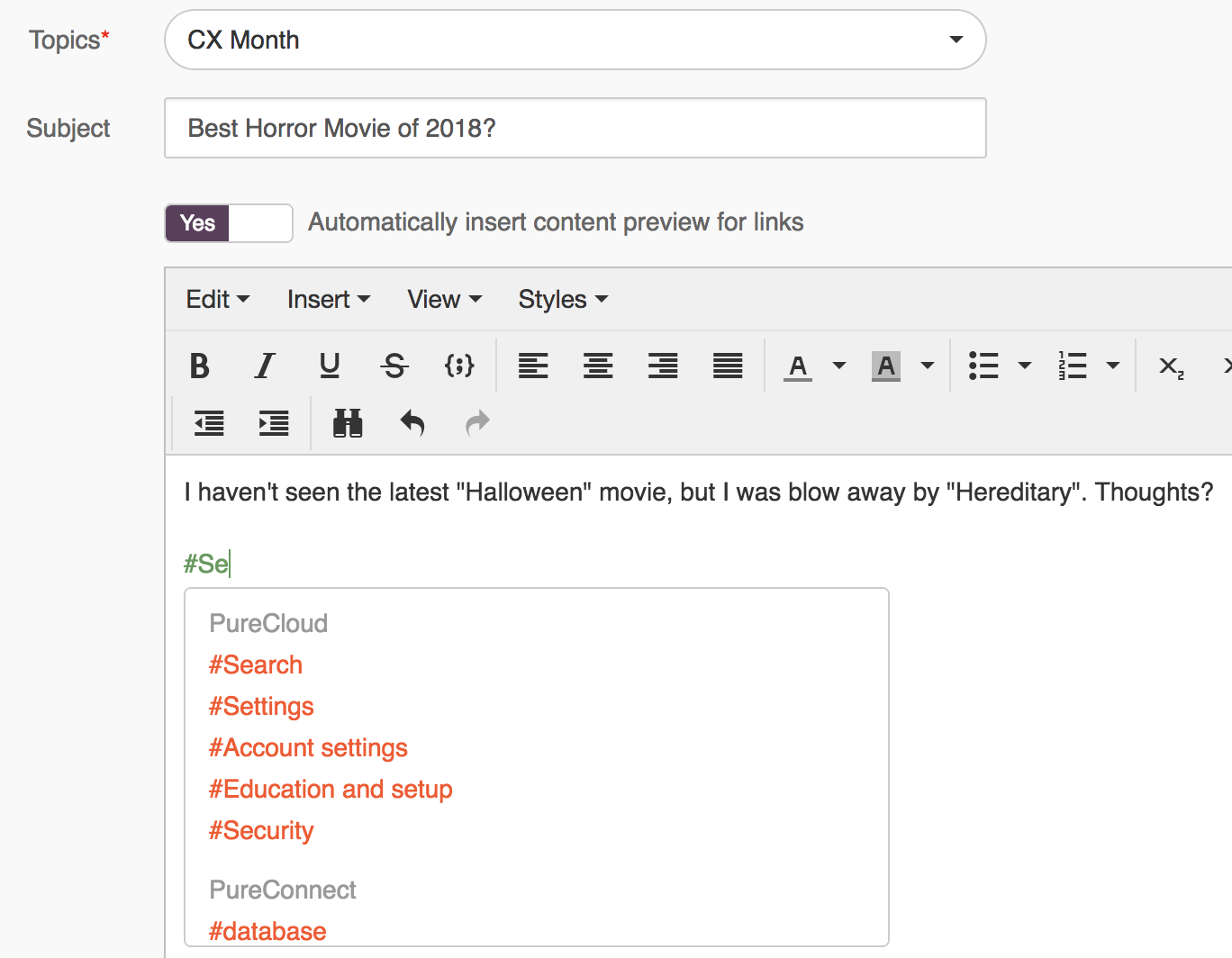 If you have tried posting in the Genesys Casual, Certification, or PureEngage Cloud communities, you may have noticed that the form to start a discussion has an extra field for "Topics". This is because those communities are called "Topic Communities". As of Tuesday (10/23/2018), all Communities will be Topic Communities. In topic communities, you must select a topic tag from a predefined list before submitting your post. Here is what the field looks like in our PureEngage Cloud Community: